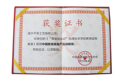 由南寧千帆教學科技有限公司設計,聯(lián)合南寧千年工藝有限公司共同研發(fā)的“千帆”品牌包埋標本學前教育益智產品--《青蛙成長記》,榮獲中國教育裝備產品創(chuàng)新獎。產品在設計上大膽創(chuàng)新,引入“與孩子共享自然”的教育理念,得到評審專家的一致認可。